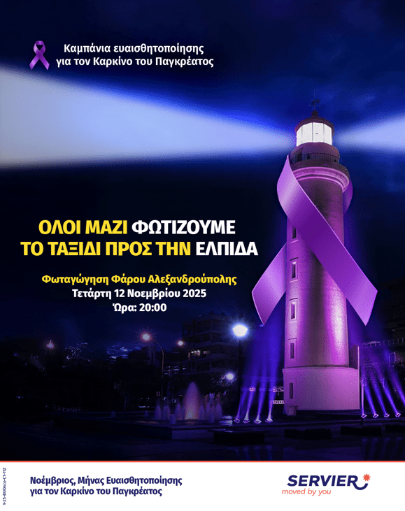 Στο πλαίσιο της καμπάνιας «Φάρος ελπίδας: Μαζί για τον καρκίνο του παγκρέατος», η Servier Hellas σε συνεργασία με τον Σύλλογο Καρκινοπαθών Εθελοντών Φίλων Ιατρών «Κ.Ε.Φ.Ι.» Αθηνών, καθώς και τον Σύλλογο Ασθενών ΣυνεχίΖΩ, διοργανώνει την Τετάρτη 12 Νοεμβρίου 2025 στις 20:00, στην πλατεία της Αλεξανδρούπολης όπου δεσπόζει ο Φάρος, το σήμα κατατεθέν της πόλης: Τη συμβολική φωταγώγηση του Φάρου, σε μωβ χρώμα, φωτίζοντας έτσι την αξία της ευαισθητοποίησης για τον παγκρεατικό καρκίνο.
